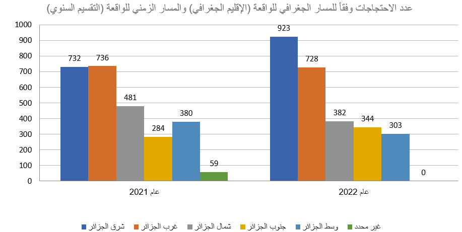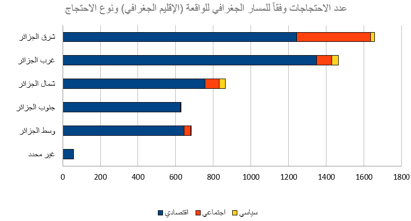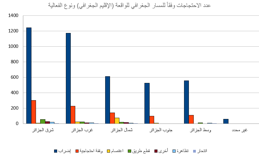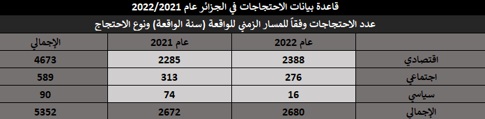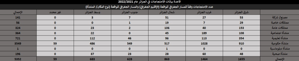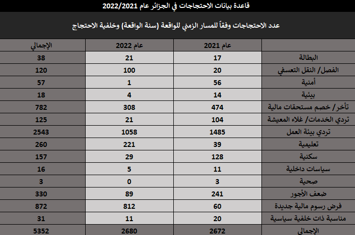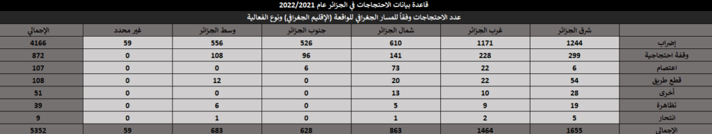 خلال تلك الفترة الزمنية وداخل ذلك النطاق الجغرافي، تم رصد وتسجيل 5,352 واقعة احتجاج. انقسمت أنواع الوقائع / الفعاليات الاحتجاجية داخل قاعدة البيانات كالآتي: (إضراب، اعتصام، تظاهرة، وقفة، عصيان مدني، انتحار، غلق / محاصرة مقر حكومي). وذلك وفقًا لأسس وقواعد جمع البيانات الموضوعية مع تحري الدقة في المعلومات، حيث اعتمد البحث على عدد من المصادر والأخبار الصحفية تصل إلى 14 مصدرًا لصحف إلكترونية ناطقة بالعربية، وهي: (آخر ساعة – أخبار اليوم – الاتحاد – الجزائر الجديدة – الجلفة إنفو – الجمهورية – الحياة العربية – الراية – الشعب – المساء – المسار العربي – النصر – وكالة الأنباء الجزائرية).
