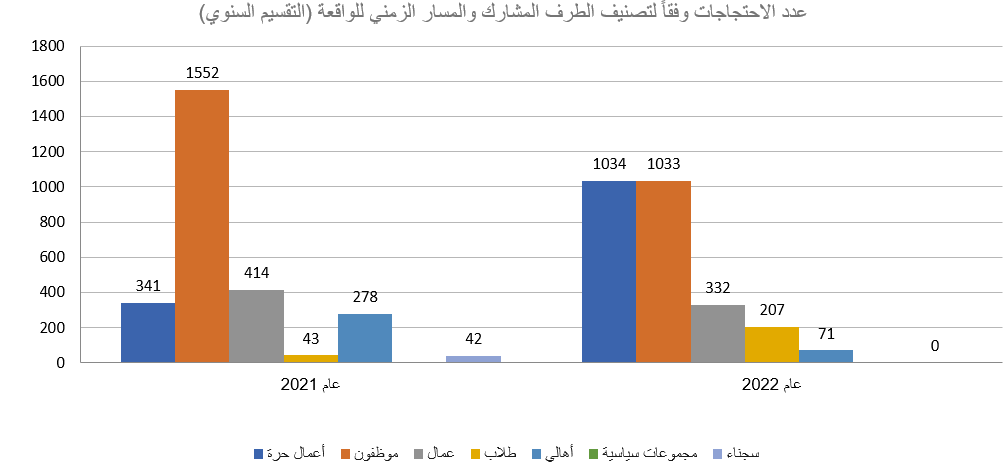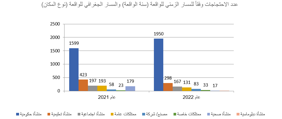 تنقسم الاحتجاجات التي تم رصدها إلى ثلاثة أنواع هي: اقتصادي، اجتماعي، سياسي. جائت وقائع الاحتجاجات ذات الخلفية الاقتصادية في المرتبة الأولى بواقع 4673 واقعة، تليها الاحتجاجات ذات الخلفية الاجتماعية التي بلغت 589 واقعة، وفي النهاية تأتي الاحتجاجات ذات الخلفية السياسية بواقع 90 واقعة. كما شملت قاعدة البيانات رصد وقائع الاحتجاج في منشآت ومؤسسات وأماكن عامة مختلفة، حيث جائت المنشآت الحكومية أولا بعدد 3549 فعالية، وتليها المنشآت التعليمية بعدد 721 فعالية، ثم المنشآت الاجتماعية بعدد 364 فعالية، والممتلكات العامة بعدد 324 فعالية.