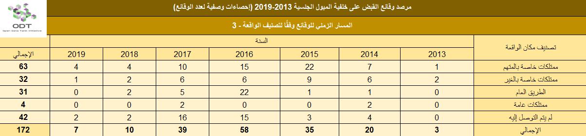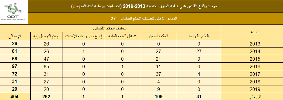 وجاء توزيع الأعوام من حيث عدد المقبوض عليهم/ن بتلك الاتهامات، بتصدر عام 2016 القائمة بعدد 97 شخصاً، ثم كل من عامي 2014 و 2017 بعدد 81 و 72 متهماً/ة على التوالي، فيما جاءت السنة الأقل هي 2013 بعدد 26 شخصاً.