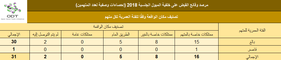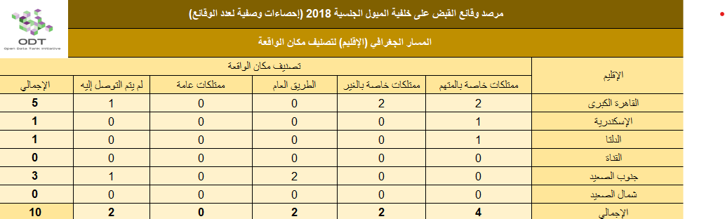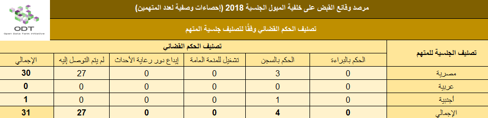قاعدة بيانات “القبض على خلفية الميول الجنسية – مصر عام 2018” هي قاعدة بيانات مطورة معلوماتيًا، تضم قاعدة البيانات قضايا الميول الجنسية (ممارسة الفسق والفجور – المثلية الجنسية) في مصر “خلال الفترة الزمنية من يناير 2018 وحتي ديسمبر 2018، تعتبر قاعدة البيانات مفتوحة المصدر ومنشورة برخصة المشاع الإبداعي بحيث تشمل تفاصيل الوقائع من حيث مسارها الزمني والجغرافي، وأطراف الوقائع. من خلال قاعدة البيانات، تم إعداد إحصاءات وصفية بين مجموعة من المتغيرات ( النطاق الجغرافي، المحافظة، نوع مكان الواقعة، نوع الواقعة / الإتهام، تصنيفات وصفية للمتهمين/ات، الإطار القانوني وتصنيف المضبوطات).