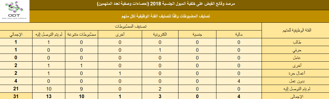 يحتوي التقرير علي قاعدة بيانات كاملة عن تعداد قضايا الميول الجنسية عام 2018 بإجمالي 10 وقائع / قضايا حيث تم القبض على 31 شخصاً, وملف أخر يحتوي علي الإحصائيات الوصفية للوقائع بإجمالي 20 جدول إحصائي، حيث استعان التقرير بمعايير ومنهجية أكاديمية في البحث الكمي.