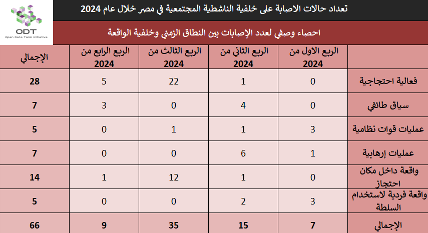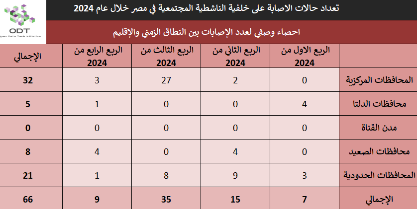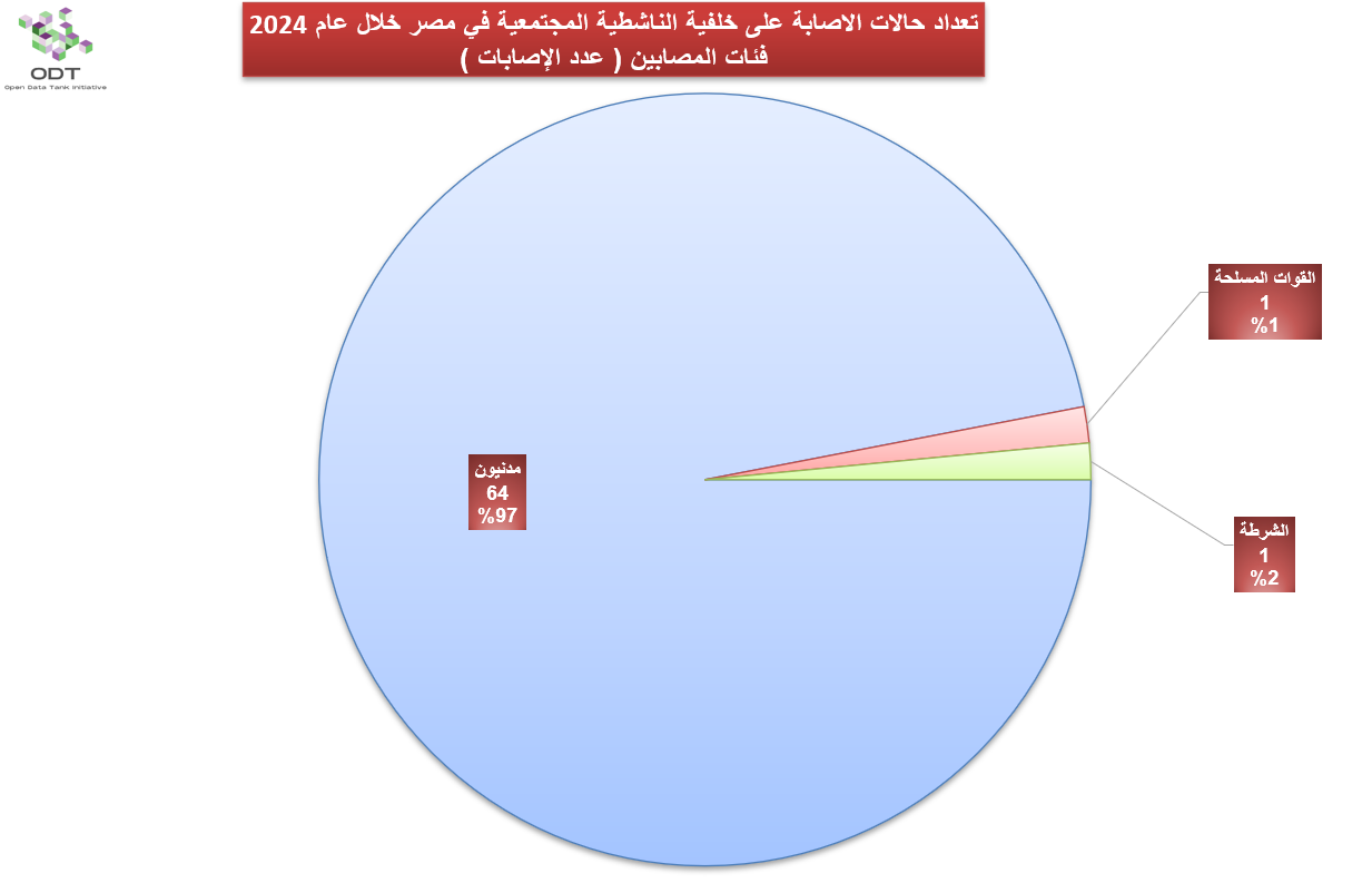 قاعدة بيانات وقائع الإصابة في مصر خلال عام 2024 (على خلفية الناشطية المجتمعية) هي قاعدة بيانات مطورة معلوماتيًا، تضم قاعدة البيانات وقائع الاصابة “خلال الفترة الزمنية من يناير 2024 وحتي ديسمبر 2024، تعتبر قاعدة البيانات مفتوحة المصدر ومنشورة برخصة المشاع الإبداعي بحيث تشمل تفاصيل الوقائع من حيث مسارها الزمني والجغرافي، وأطراف الوقائع. من خلال قاعدة البيانات، تم إعداد إحصاءات وصفية وعروض بصرية بين النطاق الزمني ومجموعة من المتغيرات ( النطاق الجغرافي، المحافظة، خلفية الواقعة، نوع الواقعة، فئة المصاب).