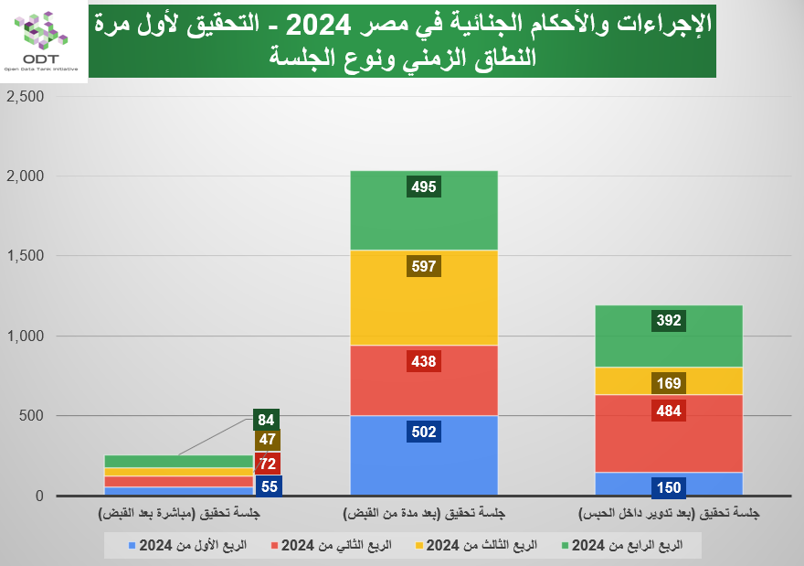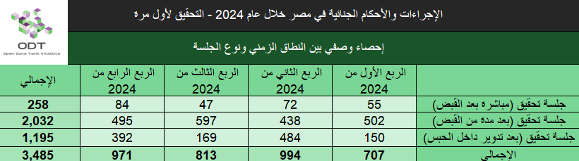 1. جلسات تحقيق لأول مرة (بعد القبض والعرض على النيابة)، حيث تم توثيق عدد 3,485 جلسة تحقيق جديدة على مدار 2024.