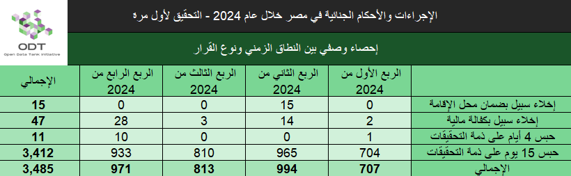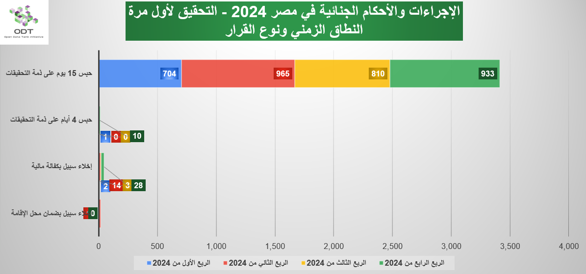 من حيث نوع القرار، تم تسجيل 3,412 قرار بـ”الحبس 15 يوم علي ذمة التحقيقات” كأعلى فئة، يليه عدد 47 قرار بـ”إخلاء سبيل بكفالة مالية“، فيما كان هناك 15 قرارا بـ “إخلاء سبيل بضمان محل الإقامة“، ثم تم تسجيل 11 قرارا بـ “حبس 4 أيام علي ذمة التحقيقات” كأقل فئة. حيث توزعت تلك القرارات عبر 994 قرارا خلال “الربع الثاني من العام“، و 971 قرار خلال “الربع الرابع من العام”، ثم 813 قرارا خلال “الربع الثالث من العام“، واخيرا 707 قرار خلال”الربع الأول من العام“.
