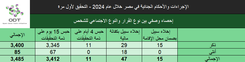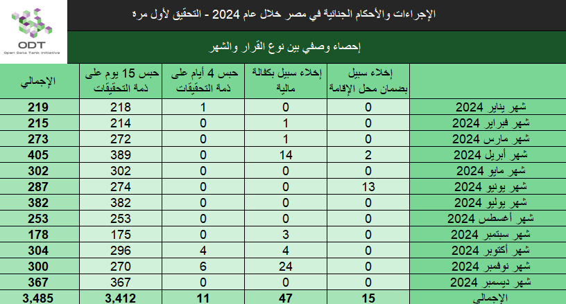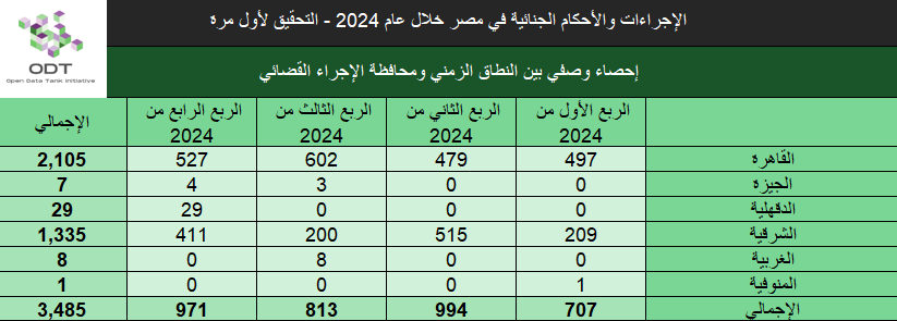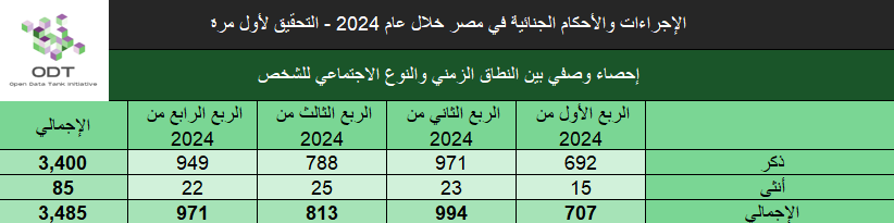 يُعد هذا الإصدار قاعدة بيانات تفصيلية وشاملة لمختلف الإجراءات والأحكام الجنائية (القضاء الجنائي) في مصر على مدار عام 2024 بداية من 1 يناير حتى 31 ديسمبر 2024، وذلك على خلفية الناشطية المجتمعية (سياسية، حقوقية، ثقافية وفنية ورياضية، اجتماعية)، وهو منقسم إلى ثلاث نماذج معلومات منفصلة: